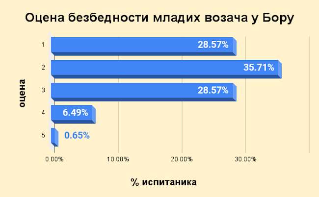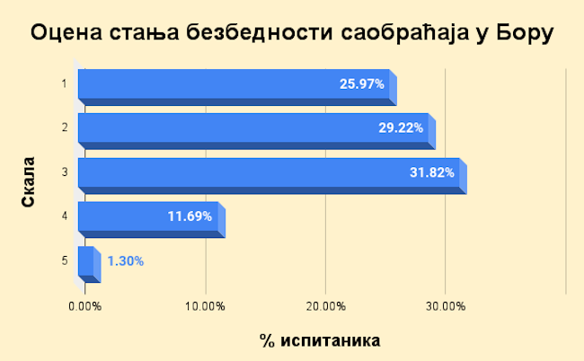 Najveći procenat ispitanika je bezbednost saobraćaja u Boru ocenio dobrom ocenom (31,82%), a potom sledi dovoljna ocena (29,22%). S druge strane, svega 1,30% ispitanika smatra da je bezbednost saobraćaja u Boru odlična.