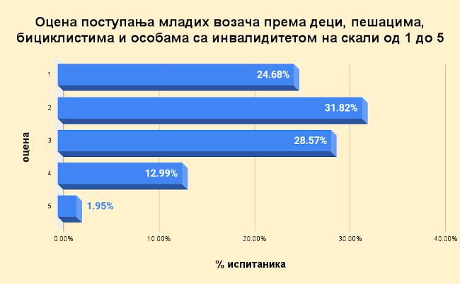 Razlog ovako loših ocena stanja bezbednosti saobraćaja u Boru, može biti povezan i sa lošim ocenama građana o tome kakvo je postupanje mladih vozača prema ranjivim učesnicima u saobraćaju. Najveći procenat ispitanika (31,82%) postupanje vozača ocenjuje dovoljnom ocenom, a potom slede dobra (28,57%) i nedovoljna (24,68%). Dok je 1,95% ispitanika dalo najveću ocenu.