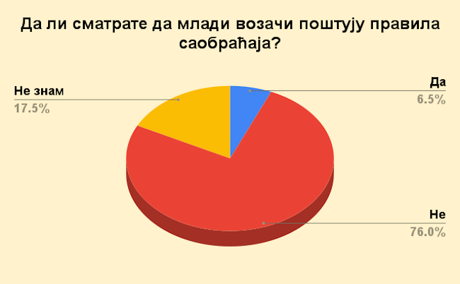 Ako govorimo o poštovanju i poznavanju pravila saobraćaja kao preduslovu za bezbednu vožnju, možemo ustanoviti da najveći broj ispitanika (76%) je stava da mladi vozači ne poštuju pravila saobraćaja.