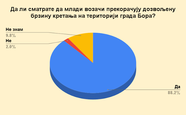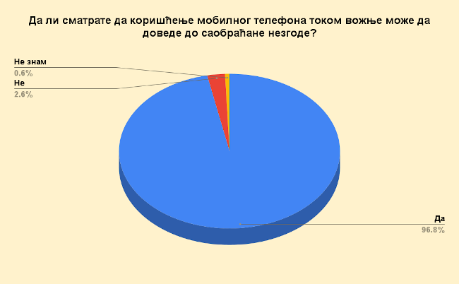 96,8% ispitanika smatra da upotreba mobilnog telefona može da dovede do saobraćajne nezgode, dok 88,2% smatra da mladi vozači prekoračuju dozvoljenu brzinu kretanja.