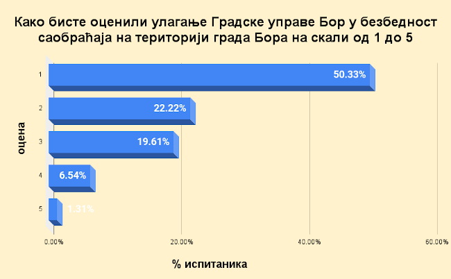 Zanimljiv podatak je, da je najveći procenat ispitanika rad Gradske uprave u Boru na polju bezbednosti saobraćaja je ocenilo nedovoljnom ocenom (50,33%), a potom sledi dovoljna ocena (22,22%).