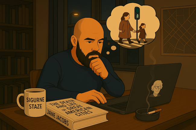 Pomenuta scena na ulici me je naterala da po drugi put sa police uzmem knjigu Smrt i život velikih američkih gradova. Na korici ima mrlju od kafe — ostatak jednog prepodneva i uspomene na život u studentskom domu Karaburma. Gledajući u korice razmišljam, ponekad te knjige ne pronalaze i ne dozivaju slučajno, već dolaze kao odgovor na pitanja koja svakodnevno sebi postavljaš. Nije to bila literatura iz struke, niti obavezna lektira u školi. Ova knjiga je simbol urbane revolucije. Ne one bučne, ne one koja gori na trgovima, već one tihe, ali neizbežne — revolucije koja ulicu vraća ljudima.